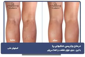 3. نتایج فوری: بسیاری از بیماران بهبود ظاهر رگ‌های واریسی خود را بلافاصله پس از درمان مشاهده می‌کنند.